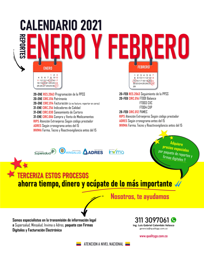 En Quality GS encuentra todo lo que necesita para estar tranquilo, nos especializamos en la transmisión de reportes a la SUPERSALUD, MINSALUD e INVIMA de acuerdo con la reglamentación vigente para IPS´s y AMBULANCIAS, somos distribuidores directos de firmas digitales con CERTICAMARA S.A y ofrecemos servicios para la presentación de informes reglamentarios a las entidades de control.